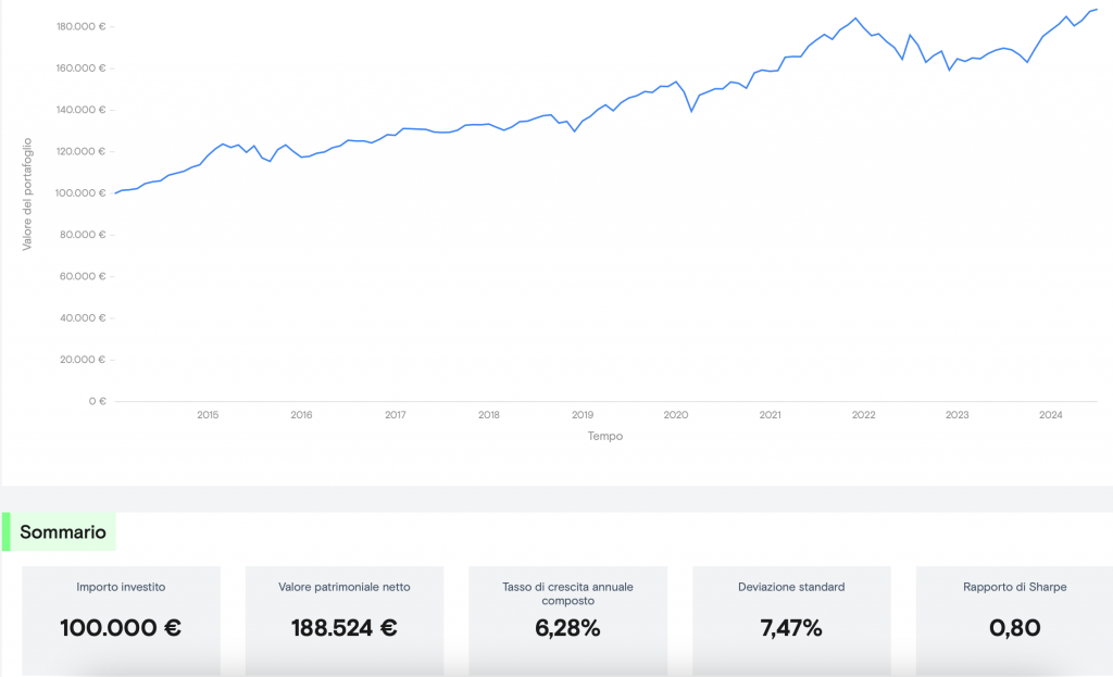Tieni a mente che un piano finanziario bilanciato (50% azioni e 50% obbligazioni) dovrebbe averti reso almeno il 6,2% all’anno negli ultimi 10 anni. Tradotto in parole semplici: 100.000 euro sarebbero diventati 188.000€ (che siano 10.000€/100.000€/1.000.000€ non cambia, questi sarebbero stati i risultati).