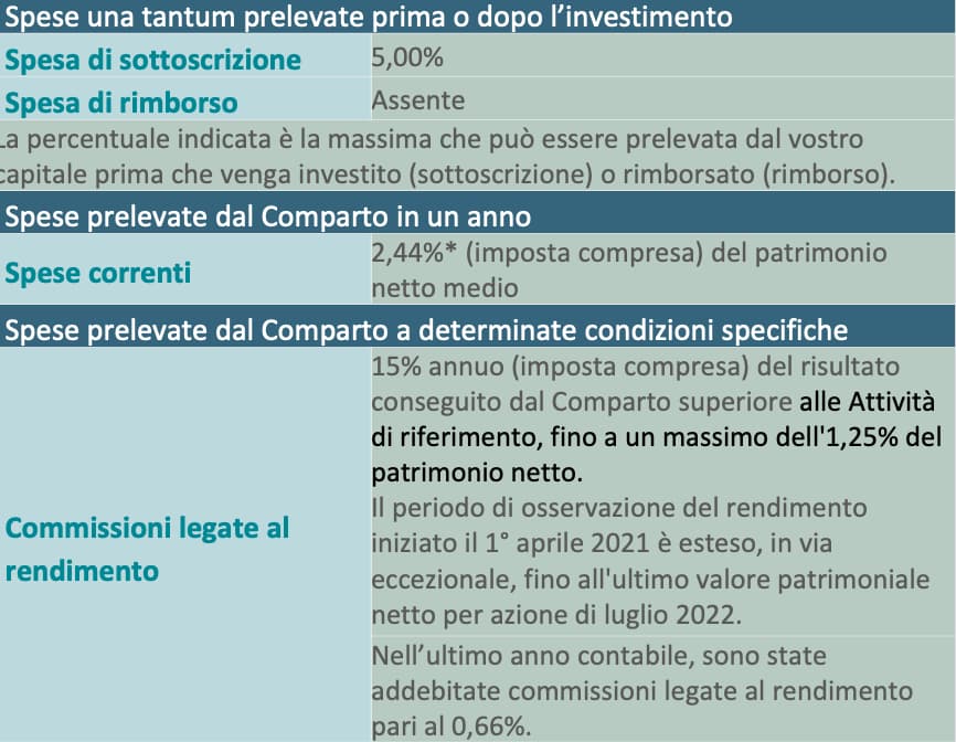Le spese correnti sono pari al 2,44% di cui il 2% riferito alla commissione annuale di gestione. È prevista una commissione di performance nella misura del 15% dell’overperformance riferita al benchmark di categoria, ma con un massimo dell1,25%.