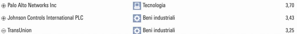 Al primo livello del podio troviamo la società informatica Palo Alto Networks Inc. che nel 2021 ha conseguito un fatturato di oltre 4,3 miliardi di dollari americani. Ha sede a Santa Clara, in California. È presente nel fondo con il 3,70% delle quote.