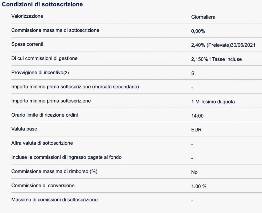 E’ infine presente una fastidiosa “commissione di performance” pari al 20,00 % dell’over performance del fondo rispetto al benchmark di riferimento prescelto.