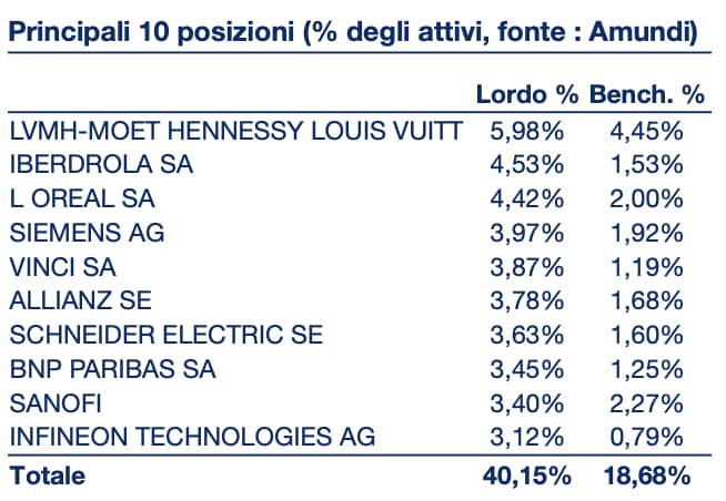 1. Il primo posto dell’Amundi Euroland Equity è occupato dal gigante francese del lusso LVMH-MOET HENNESSY LOUIS VUITTON con il 5,98% delle quote.