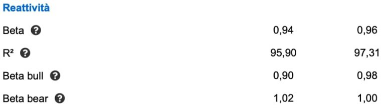 L’R Quadro raggiunge il valore di 97,31 e ci informa del fatto che l’indice della categoria (il benchmark) spiega poco più del 97% della variabilità della performance passata del fondo. Questo ci dice che il fondo tende quasi a replicare il benchmark, effettuando piccole variazioni.
