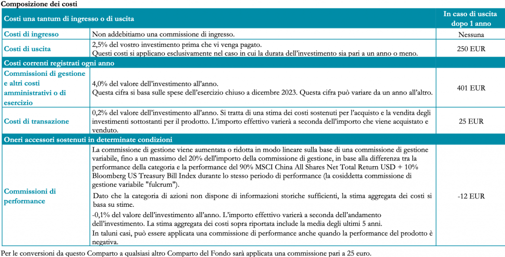 Le spese correnti totali (TER) del fondo ammontano a oltre il 4% all’anno. Il TER include non solo la commissione di gestione, ma anche altre spese operative, come le spese di amministrazione, custodia, audit, e marketing.