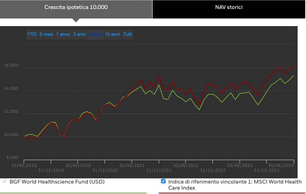 - 2014 (+23,8%) e 2019 (+23,7%): Questi anni sono stati eccezionalmente positivi per il fondo, con rendimenti vicini al 24%. Questi periodi di forte crescita possono essere attribuiti a innovazioni significative nel settore sanitario, come nuovi farmaci e tecnologie mediche, oltre a un contesto economico favorevole che ha beneficiato il mercato azionario globale.