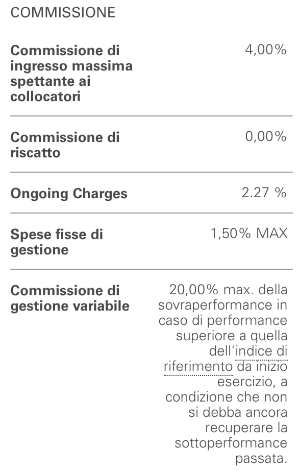È invece presente una spiacevole “commissione di performance” pari al 20% dell’extra rendimento del fondo rispetto al parametro oggettivo di riferimento.