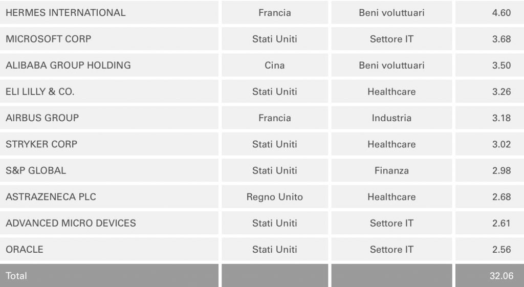 - Al primo posto ritroviamo la francese Hermès International. Fondata a Parigi nel 1837 Hermès è un’azienda di moda (alta moda e prêt-à-porter, accessori, pelletteria, borse, arredamento, accessori per la casa, gioielli, profumi e valigie di lusso). Stiamo parlando di una tra le dieci principali società del settore al mondo! Nel fondo occupa il 4,60% delle quote. Inutile aggiungere che è quotata alla Borsa valori di Parigi.