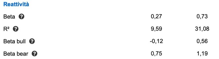 Il Beta ha un valore pari a 0,73 che rispecchia in pieno le caratteristiche esposte in precedenza, facendo oscillare il valore delle quote meno che proporzionalmente rispetto al parametro oggettivo di riferimento preso a paragone.