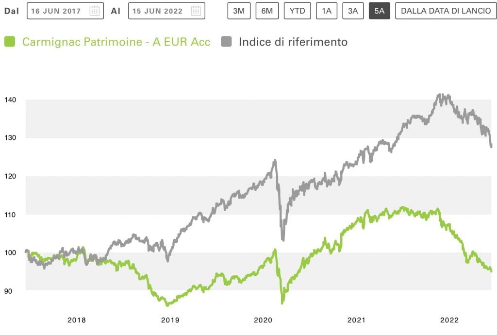 Da gennaio il risultato del Carmignac patrimoine è negativo del 10,14%. Ad un anno è sempre negativo ma del 12,71% A tre anni torna positivo con un + 5,50% annuo. A 5 anni torna negativo del 4,33%, mentre ad 8 anni il risultato è positivo dell’8,63% annuo.