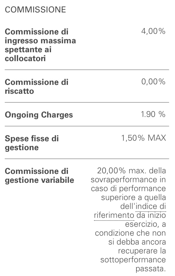 È prevista una commissione di performance “variabile” pari al 20% della sovraperformance del fondo rispetto al benchmark, dedotte eventuali perdite in conto capitale riferite ad anni precedenti.