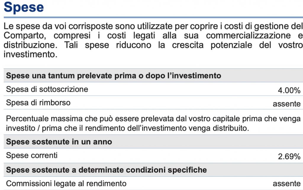 Il livello delle spese correnti è pari al 2,69% di cui l’1,5% è da attribuire alla commissiona annua di gestione a carico del fondo.
