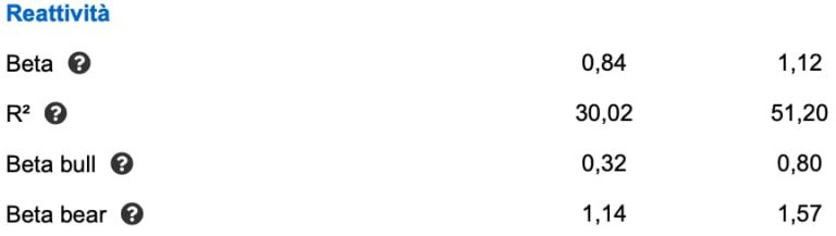 Il Beta ha un valore pari a 1,12 e significa che è il 12% più reattivo rispetto all’andamento del mercato di riferimento (sia al rialzo che al ribasso).