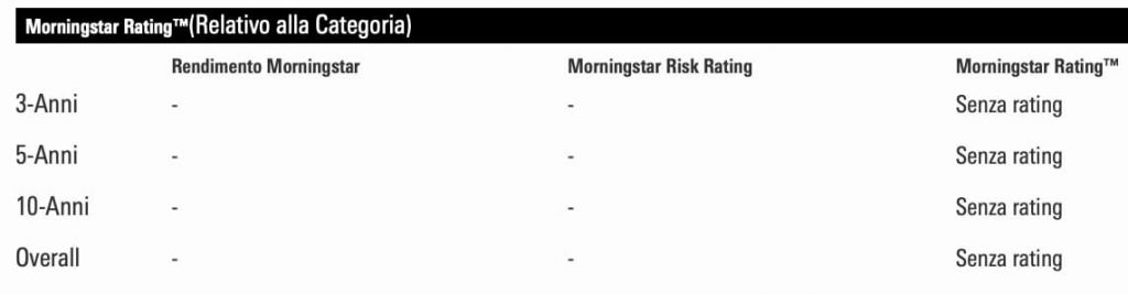 Il rating inerente la qualità del prodotto fornita da Morningstar è assente, questo per l’assenza di storicità della classe del fondo.