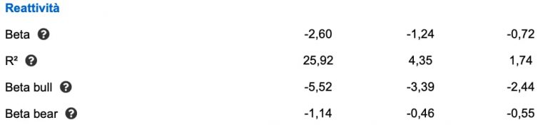 Il Beta assume un valore pari a – 1,24 e significa che il fondo oscillerà in direzione opposta rispetto al suo benchmark di riferimento. In parole semplici significa che il gestore si collocherà stabilmente in strategie “contrarian” rispetto ai mercati. Il ricorso notevole a posizioni “corte” ne è l’assoluta conferma.