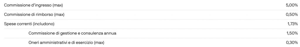 - Commissioni di gestione: 1,50%, che coprono i costi per la gestione attiva del fondo.