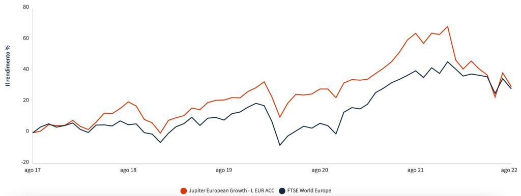 Gli obiettivi dichiarati e la politica d’investimento sono estremamente chiari e dettagliati. Lo Jupiter European Growth mira a conseguire la crescita del capitale nel lungo periodo. Gli investimenti saranno concentrati principalmente nelle azioni di società con sede legale in Europa. Il fondo promuove continuativamente caratteristiche ambientali, sociali e di governance. Tali caratteristiche selezionate dai due gestori comprendono la promozione della transizione verso un’economia a basso tenore di carbonio e l’assunzione delle responsabilità verso le persone e il pianeta.