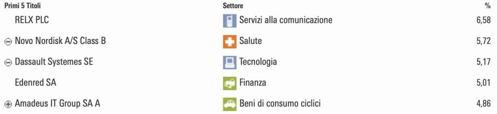 Il titolo in portafoglio più presente è RelX Group PLC. con il 6,58 % delle quote. Si tratta di una multinazionale britannica di informazioni e analisi con sede a Londra, Inghilterra. Le sue attività forniscono informazioni e analisi scientifiche, tecniche e mediche; informazioni legali e analisi; strumenti decisionali; e organizzare mostre. Opera in 40 paesi e serve clienti in oltre 180 nazioni.