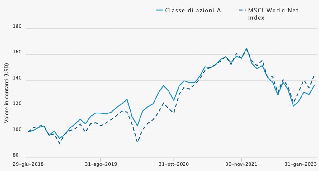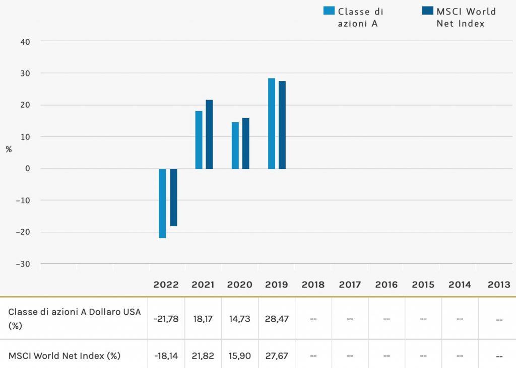 Per la nostra analisi abbiamo selezionato la classe A tra tutte quelle disponibili. È valorizzata in euro e non sono presenti strategie di immunizzazione dai rischi di cambio, vale a dire che il fondo è “a cambio libero”, non hedgiato. Abbiamo preferito la soluzione “ad accumulo” dei profitti, piuttosto che la classe a stacco della cedola.