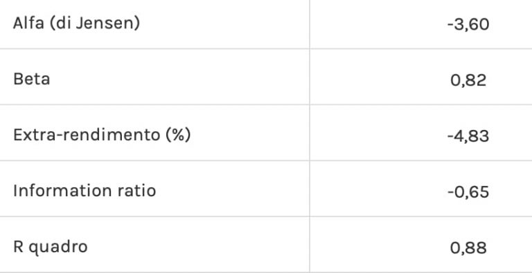 L’R Quadro è pari a 0,88. In questo caso l’informazione assume questo valore: l’indice della categoria spiega poco più dell’88% della variabilità della performance passata del fondo. Trattandosi di un valore superiore al 50% è ben chiaro il fatto che la gestione “attiva” del fondo assume valore preminente a discapito del paniere di titoli presenti all’interno del benchmark di categoria.