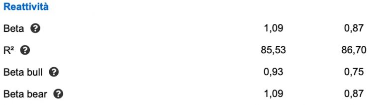 L’R Quadro assume il valore di 86,70 che va a premiare la tipica “gestione attiva” adottata come stile di gestione. Il valore significa che l’86,70% della variabilità del benchmark sarà responsabile delle performance future del fondo. In altre parole: i titoli presenti all’interno dell’asset saranno differenti e non coincideranno con quelli presenti nel benchmark che, come sappiamo bene, è spesso rappresentato da un algoritmo “sintetico”.