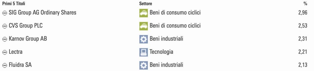 Il titolo più presente in portafoglio è quello della svizzera SIG GROUP AG., attiva nel settore merceologico degli imballaggi, con il 2,96% delle quote.